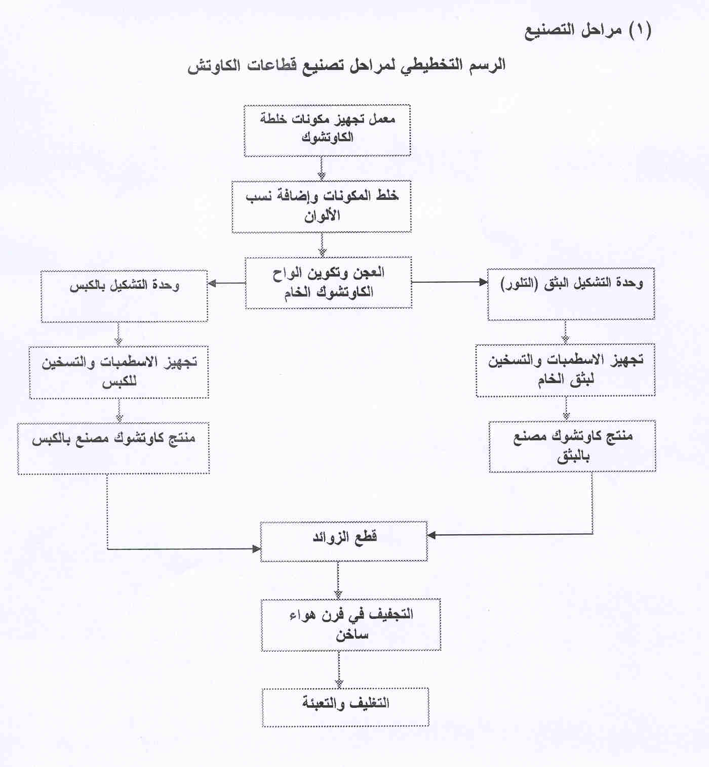 مراحل تصنيع قطاعات الكاوتشوك المختلفة أما أن تكون بطرق البثق في قوالب أو التشكيل بالكبس أيضا في قوالب مصممة لذلك . وكما يوضح الرسم التخطيطي فإن خطوات التصنيع تتلخص فيما يلي : · يتم تجهيز مكونات خلطة الكاوتشوك بالنسب الموضحة سابقا · يتم خلط المكونات وإضافة الألوان · يتبع ذلك عملية عجن الكاوتش وك وتكوين ألواح من الكاوتشوك الخام الذي يستخدم في تكوين المنتجات إما عن طريق البيثق أو الكبس أولا : خط البثق - يتم تجهيز وإسطمبات التشكيل وتركيبها علي ماكينة البثق - توضع ألواح الكاوتشوك المجهزة سابقا بماكينة البثق ثم تتم عملية التسخين والبثق في قوالب التشكيل - يرفع المنتج المتكون وطبقا لتشكيل الإسطمبة المستخدمة لتكوين المنتج - تقطيع الزوائد - يجفف المنتج في أفران هواء ساخن - يغلف المنتج ثم يعبأ في أكياس من النايلون ثانيا : خط الكبس - يتم تجهيز إسطمبات التشكيل بالكبس وتركيبها علي المكبس الهيدروليكي - توضع ألواح الكاوتشوك المجهزة سابقا بداخل الاسطمبات ثم تتم عملية الكبس والتسخين في نفس الوقت ويتم التشكيل بهذه الطريقة - يرفع المنتج المتكون وطبقا لتشكيل الاسطمبة المستخدمة لتكوين المنتج - تقطع الزوائد - يجفف المنتج في أفران هواء ساخن - يغلف المنتج ثم يعبأ في أكياس من النايلون (2) المساحة والموقع : يحتاج هذا المشروع مساحة قدرها 80م2 للورشة والمخزن ويمكن أن يقام داخل المدن أو بالمدن الجديدة . (3) المستلزمات الخدمية المطلوبة : يحتاج المشروع إلي طاقة كهربائية 220/380 فولت بقدرة 6 ك .وات = 8 حصان والتكلفة الشهرية الطاقة 300جم المياه 15جم وإجمالي التكاليف الشهرية 315جم (4) الآلات والمعدات والتجهيزات :