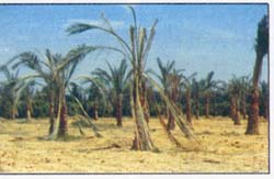 9- سهولة كسر جذع النخلة المصابة بفعل الرياح مع ملاحظة الألياف المتهتكة والأنفاق وبداخلها الأطوار المختلفة للنخلة .