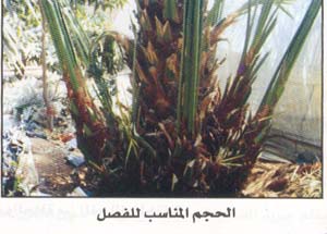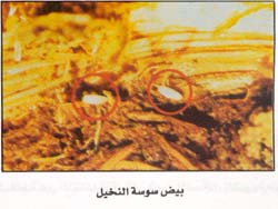 7- العناية بالعمليات الزراعية والبستانية لإنتاج نخلة فى حالة قوية ونظيفة مع تقليم الفسائل الصغيرة وتقليل عددها لتسهيل فحصها وإكتشاف أى إصابة .