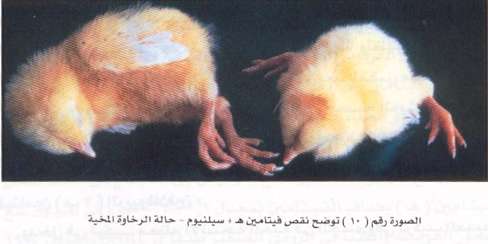 نقص فيتامين ( هـ ) فى الدجاج يسبب مرض الكتكوت المجنون أو حالة الرخاوة المخية والإرتشاح الأوديمى ( الصورة رقم 10 ) والضمور العضلى وتضخم مفصل العرقوب وضمور القوصنة فى الرومى والبط .