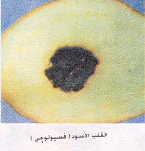 ) تشبه أعراض ضرر الصقيع ( مع ظهور هالة صفراء حولها وعند تقدم الإصابة يظهر زغب لونه رمادى على السطح السفلى للأوراق مقابل المساحات المصابة وهو عبارة عن حوامل الفطر الجرثومية التى تخرج من ثغور النبات ويختفى هذا الزغب فى الظروف الجافة ويمكن أن تصاب أعناق الأوراق والسيقان بظهور نفس البقع المسودة ثم الزغب وفى النهاية يموت العرش بأكمله .