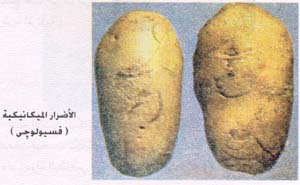 تنتج الأضرارالميكانكية أثناء الحصاد وخاصة الحصاد الآلى .. أما الكدمات فتحدث نتيجة سوء معاملة الدرنات عند التداول أو عند كدم أو دك أجولة البطاطس فى الأرض أثناء التعبئة والتخزين فتحدث الكدمات التى تظهر بوضوح عند شق الدرنات فتشاهد مساهات أرجوانية اللون قريبة من قشرة الدرنة أما التشققات فتحدث فى جلد الدرنة وغالباً مايتكون لون بنى أسفل هذه الشقوق .