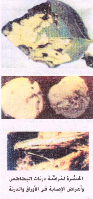 - مقاومة حشرة فراشة الدرنات والحيلولة دون وصولها للدرنات بتغطية الدرنات والترديم المستمر أو بعد ترك التربة تتشقق حتى لاتصل الفراشة للدرنات وتضع بيضها عليها .