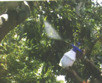 عند ارتفاع تعداد الآفة يمكن اللجوء إلي المكافحة الكيميائية للحد من الضرر الناجم عن الإصابة ويتم ذلك بعمل محلول مكون من 500سم ملاثيون + 1 لتر مادة جاذبة (بومينال ) ثم استكمال الرشاشة إلي 20 لتر (18.5 من الماء) ويستخدم هذا المحلول إما في الرش الجزئي وذلك برش الأفرع الرئيسية وجذوع الأشجار بحوالي 100-250سم لكل شجرة حسب حجم الشجرة (شكل 23) ، أو بغمس الحزم القاتلة (أكياس مصنوعة من الخيش وتملأ من الداخل بقطع الخيش أو قش الأرز) وتغمس هذه الأكياس لمد 4 ساعات في المحلول ثم تعلق داخل الشجرة (في الظل) ويعاد غمس هذه الأكياس في المحلول السابق كل 7 أو 10 أيام عند ظهور الآفة وحتى جمع الثمار (شكل 24) .