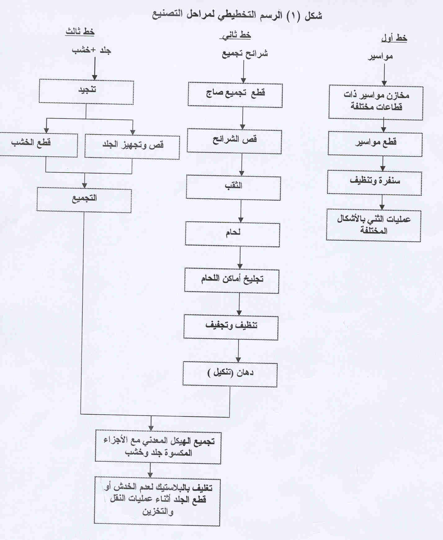 (1) مراحل التصنيع تختلف مراحل الانتاج بورش الأشغال المعدنية طبقا لنوع المنتج المطلوب ولكن هناك عناصر أساسية ثابتة تشترك فيها جميع المنتجات من الهياكل المعدنية والمطعمة ببعض الخامات الخشبية والجلدية وتتلخص هذه المراحل فيما يلي : · إعداد التصميم وعمل الرسومات الهندسية وتحديد الأبعاد لكل منتج . · تقطيع الخامات المعدنية أو الخشبية حسب الرسومات والأبعاد المطلوبة . · تشكيل الهياكل المعدنية باستخدام الثنايات . · التجميع باللحام (كهرباء – اكس استيلين) أو مسمار تجميع · التشطيب والتنظيف بحجر التجليخ . · الدهانات (دهان عادي ببويات اللاكيه – دهان دوكو عادي أو فرن – طلاء بالترسيب الكهربي ) · تجهيز وتشطيب الأجزاء الخشبية إن وجدت في المنتج المطلوب كما هو الحال في خط إنتاج الكرسي ذو الهيكل المعدني والمقعد الخشبي أو المنجد بالإسفنج . · تشطيب وإنهاء المنتج وتركيب الإكسسوارات · التغليف بالخامات البلاستيكية لحماية الأسطح من الخدش . ويوضح شكل (2) رسما تخطيطياً لمراحل تصنيع كرسي معدني ذو مقعد وظهر خشبي مكسي بالجلد الصناعي . والجدول رقم (1) يبين تتابع العمليات الصناعية موضحة بالرسومات التنفيذية والمعدات المستخدمة لكل عملية .